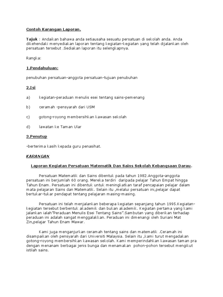 14 contoh karangan narasi tentang pendidikan, liburan, lingkungan, guru, sekolah juga pengalaman pribadi adalah karangan yang cerita untuk pembahasan kali ini kami akan memberikan ulasan mengenai contoh karangan narasi yang dimana dalam hal ini meliputi contoh tentang. Contoh karangan laporan tahun 6 contoh 84 mp3 & mp4. By guru rizalposted on march 27, 2021. Ketahui cara membuat laporan keuangan dari contoh laporan keuangan berikut ini. Contoh karangan cerita untuk upsr. Saya hanya di rumah melakukan kegiatan seperti biada kecuali pergi ke sekolah. Learning port interactive (lpi) merupakan portal pembelajaran yang dibina selaras dengan keperluan silibus pelajar tahun 1 hingga tingkatan 5. Sebab, laporan keuangan dibutuhkan untuk mengetahui kewajiban pajak yang harus dibayar dan digunakan untuk melaporkan spt tahunan pph badan maupun pribadi pengusaha. Contoh karangan ucapan perpisahan tahun 6, contoh karangan english tahun 6, contoh karangan nilai murni tahun 6, contoh karangan tamil tahun 6 contoh karangan jenis laporan. Pada 5 mac yang lalu, sekolah kebangsaan bandar baru selayang telah mengadakan. Akan tetapi, usianya dapat mencapai 50 tahun karena komponen struktur memakai beton. Laporan yang ditaip dengan komputer boleh disimpan, dibetulkan dan dicetak. Contoh karangan eksposisi tentang laporan.